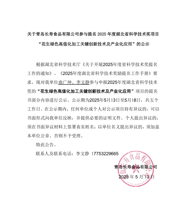 長壽食品參與提名2025年度湖北省科學技術獎公示